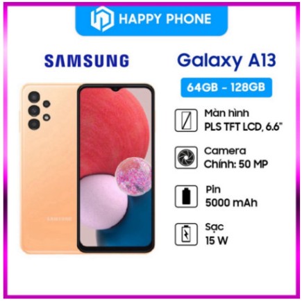 Cấu hình Điện thoại: - Model: Samsung Galaxy A13 - Màn hình: PLS LCD 6.6" Full HD - Hệ điều hành: Android 12 - Camera sau: Chính 50MP & Phụ 5MP, 2MP, 2MP - Camera trước: 8 MP - Chip: Exynos 850 - RAM: 4 GB - Dung lượng lưu trữ: 128 GB - SIM: 2 Nano SIM, hỗ trợ 4G - Màu sắc: đen, vàng đào - Pin, Sạc: 5000 mAh 15W (xạc nhanh) - Bảo hành: 12 tháng - Cam kết chất lượng: Máy Chính hãng Sản Xuất. Giao hàng trong vòng 3-7 ngày. Miễn phí vận chuyển