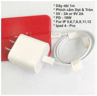 Bộ sạc nhanh 18 W cho iphone ipad, củ sạc và dây cáp type c to lightning cho IP 6 7 8 X 11 11pro ... Mô tả sản phẩm: - Tên sản phẩm: bộ sạc nhanh 18W - Kiểu dáng: Dài/ Dẹt - Kết nối: TypeC to Lightning - Công nghệ: Qualcomm Qc - Nguồn vào: 100- 240v - Nguồn ra: 5v-3A or 9v 2A - Tương thích: Iphone, Ipad - Hàng tiêu chuẩn EU chất lượng cao - Thiết kế nhỏ gọn, tinh tế. - Bảo hành 12 tháng. - Công suất cao, sạc nhanh vượt trội - Tự ngắt khi đầy, đảm bảo an toàn. Hàng được giao trong vòng 3-5 ngày